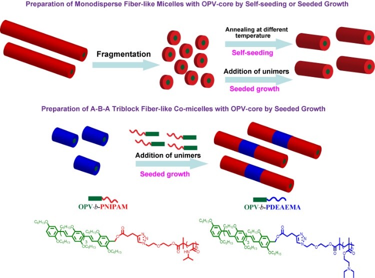 中国科学院上海有机化学研究所有机功能分子合成与组装化学院重点实验室黄晓宇课题组长期以来一直致力于功能性纳米体系的精细构筑,通过高分子合成化学和组装化学的巧妙运用,取得了一系列研究成果(ACS Macro Lett. 2016, 5, 1339; ACS Macro Lett. 2016, 5, 168; ACS Appl. Mater. Interfaces, 2017, 9, 14647;ACS Appl. Mater. Interfaces, 2017, 9,16517;ACS Appl. Mater. Interfaces, 2016, 8, 17352;ACS Appl. Mater. Interfaces, 2016, 8, 6685)。在此基础上,他们对含有对苯撑乙烯撑寡聚物(OPV)的共聚物结构进行优化,提高OPV之间强的p-p堆砌作用和结晶性,将结晶驱动自组装中的“自晶种”(self-seeding)和“种子增长” (seeded growth)过程应用于以OPV为核的纳米纤维状胶束的精确制备中。基于温度诱导的“自晶种”(self-seeding),通过改变退火温度,在纳米尺度上精确地调控单分散的纳米纤维状胶束的长度;基于“种子增长”(seeded growth)的结晶驱动自组装,通过改变所加入的聚合物和原有溶液中种子胶束的比例,在纳米尺度上精确地调控单分散的纳米纤维状胶束的长度。更为重要的是,由于“种子增长”(seeded growth)和活性聚合过程相类似,他们还可以在纳米尺度上精确调控所制备的单分散纳米纤维状胶束壳层的组成(J. Am. Chem. Soc. 2017, 139, 7136.)。
