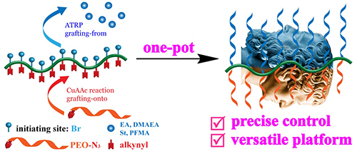 中国科学院上海有机化学研究所有机功能分子合成与组装化学院重点实验室黄晓宇课题组长期以来一直致力于接枝共聚物合成平台的精细构筑,通过高分子合成化学的巧妙运用,取得了系列研究成果(Polym. Chem. 2016, 7, 613. ACS Appl. Mater. Interfaces 2016, 8, 6685. ACS Appl. Mater. Interfaces, 2017, 9, 16517.)。在此基础上,他们采用RAFT(可逆加成断裂链转移)聚合,ATRP(原子转移自由基聚合),CuAAC(铜催化的叠氮和块基的环加成反应),grafting-from (从主干接枝)和grafting-onto (向主干接枝)相结合的策略,巧妙设计了双接枝共聚物的通用合成平台。其关键在于他们合成了一种全新的基于丙烯酸酯结构,同时含有炔基与2-羰基溴基团的三官能团功能性单体Br-acrylate-alkyne,并通过均聚得到了双功能化大分子试剂poly(Br-acrylate-alkyne),可以一锅法同时进行ATRP与CuAAC反应,一步合成不同种类的双接枝共聚物,并能对共聚物的组成进行精确控制。更为重要的是,他们通过后续侧链聚五氟苯酯的官能团转换,进一步拓宽了双接枝共聚物合成平台的单体适用范围。这一平台的成功构建证明了ATRP与CuAAC反应可以在同一体系中正交互不干扰地进行,很大程度上解决了接枝共聚物的合成难题。相关工作已发表在(Nat. Commun. 2017, 8, 333. 链接:http://www.nature.com/articles/s41467-017-00365-2)