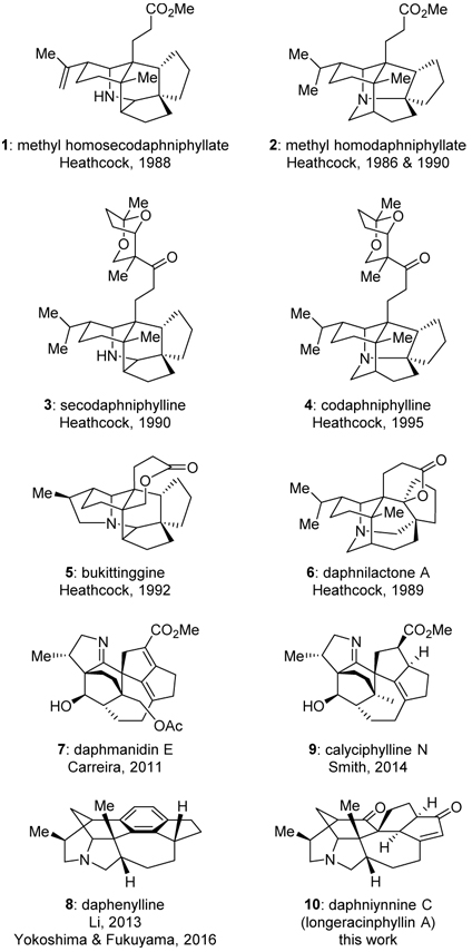 虎皮楠生物碱 (Daphniphyllum alkaloids) 具有抗肿瘤、抗病毒和调控神经生长因子等多种生物活性,在过去三十年中受到了合成化学家的密切关注。该家族超过300个成员中仅有9个分别被Heathcock、Carreira、Smith、Fukuyama和李昂课题组成功合成。Daphniynnine C (longeracinphyllin A) 是由中科院上海药物所岳建民课题组 (从Daphniphyllum yunnanense中分离) 和中科院昆明植物所郝小江课题组 (从Daphniphyllum longeracemosum中分离) 先后报导的一个多环生物碱,是虎皮楠生物碱中成员较多的calyciphylline A小家族的代表性分子之一。它具有6?6?5?7?5?5的六环核心结构以及多个连续的手性中心,具有较大合成挑战性。