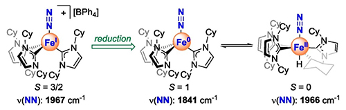 中国科学院上海有机化学研究所金属有机化学国家重点实验室的邓亮课题组一直致力于低配位低价态铁钴配合物促进的小分子活化反应研究。在之前的工作中,他们以环己基卡宾(ICy)为配体实现了高自旋一价铁分子氮配合物[(ICy)3Fe(I)(N2)][BPh4]和高自旋零价铁分子氮配合物[(ICy)3Fe(0)(N2)]的合成,发现零价铁分子氮配合物在溶液中可转化为二价铁分子氮配合物(图1)。其中,零价铁分子氮配合物中的氮氮键红外伸缩振动频率(1841 cm-1)是目前已报道的铁末端分子氮配合物中最低的,表明具有强给电子能力的氮杂环卡宾在氮气分子配位活化中具有的潜能(Chem. Eur. J. 2016, 22, 14162)。在此基础上,他们开展了钴-分子氮配合物的研究,实现了负一价钴双(分子氮)配合物的合成以及配位氮分子的官能化反应(J. Am. Chem. Soc. 2018, 140, 2239-2250)(图2)。