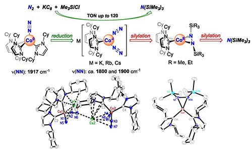 研究发现,零价钴分子氮配合物[(ICy)3Co(0)(N2)]经碱金属还原可以得到负一价钴双(分子氮)配合物M[(ICy)2Co(-1)(N2)2] (M = K, Rb, Cs)。这些负一价钴双(分子氮)配合物中的氮气分子在质子酸的作用下可以部分选择性地转化为肼,产率为24-30%(相对于钴);与R3SiCl(R = Me, Et)反应,可以实现氮气分子的1,2-二硅化,形成钴二氮烯配合物[(ICy)2Co(II)(?2-R3SiNNSiR3)],这也是首例由氮气分子官能化直接制备的后过渡金属二氮烯类配合物。在还原剂KC8和Me3SiCl存在下,配合物[(ICy)2Co(II)(?2-Me3SiNNSiMe3)]中的含氮基团可以高产率地转化为N(SiMe3)3。在此基础上他们进一步发展了氮杂环卡宾钴配合物催化的氮气分子的还原硅化反应,TON值达120,超过了目前已报道的3d金属催化体系。该项工作拓展了后过渡金属在氮气活化转化方面的应用,对新的后过渡金属催化体系的设计具有指导意义。