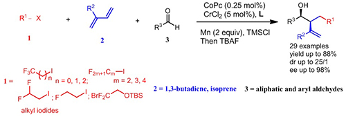 在前期研究工作的基础上,他们设计了自由基启动的串联反应,在铬/钴双金属催化体系下,首次实现了1,3-丁二烯、简单卤代烃和醛的三组分不对称烷基化和羟烷基化串联反应;通过1,3-丁二烯的1,2-双官能团化,简易构建了一系列高对映体过量的高烯丙基醇 (J. Am. Chem. Soc. 2018, 140, 2735) (图1)。该反应策略原料简单易得,反应条件温和,对于各种含三氟甲基、二氟甲基、一氟甲基、多氟的卤代烃和普通的卤代烃,以及芳香醛、脂肪醛均可以反应,实现了简单大宗化学工业品一步转化合成手性(含氟)高烯丙基醇化合物。为药物研发和材料科学的发展提供了新的可能路径,也为1,3-丁二烯、共轭二烯的不对称转化提供了新的策略。
