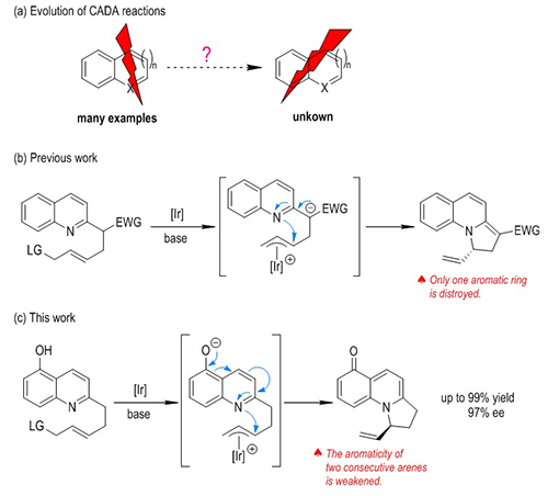 中国科学院上海有机化学研究所金属有机化学国家重点实验室游书力研究员团队一直致力于铱催化不对称烯丙基去芳构化反应研究(Acc.Chem. Res.2014,47, 2558)。2014年,他们发现通过在碱性条件下攫取苄位活泼质子的方法,可以使贫电子芳杂环如吡啶、吡嗪作为良好的氮亲核试剂参与不对称烯丙基去芳构化反应(Angew. Chem. Int. Ed.2014,53, 6986)。随后他们又将该策略成功地推广到喹啉、异喹啉、苯并噁唑、苯并噻唑、苯并咪唑等多类含氮芳杂环(J. Am. Chem. Soc.2015,137, 15899; Angew. Chem. Int. Ed.2017,56, 1530)。
