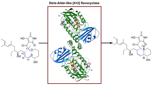 Diels-Alder(D-A)反应是人们所最为熟知的有机人名反应之一,并被广泛地应用于合成化学、药物化学、材料化学和化学生物学的研究中。人们基于路易斯酸活化以及氢键活化策略设计了不同的小分子催化剂以催化D-A反应,同时还通过分子定向进化的方法筛选得到了能够催化D-A反应的RNA酶和DNA酶。但是长期以来,人们对于自然界中是否存在天然的能够催化D-A反应的酶这一问题以及其可能的催化机制,却一直存在争议。