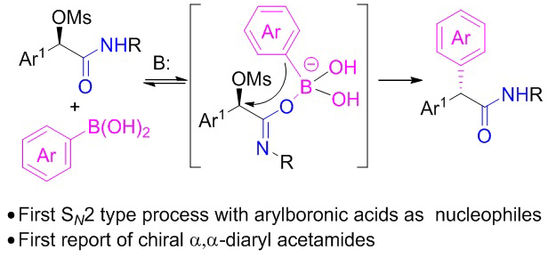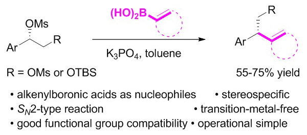发展立体选择性或专一性的偶联反应实现手性分子的高效构建是当今有机化学领域中的重要研究方向。近年来过渡金属催化立体选择性或专一性的偶联反应有了较快的发展,但仍然存在过渡金属催化剂用量大、手性控制不佳等局限。传统的SN2反应也是实现立体专一性碳(sp2)-碳(sp3)间偶联的重要手段,但由于采用高活性的锂试剂或格式试剂,往往需要很低的温度,而且官能团兼容性较差。由于烯基/芳基硼酸的亲核性较弱,它们常常应用于过渡金属催化的偶联反应中,或对π体系进行加成如Petasis Borono-Mannich反应。利用烯基/芳基硼酸做为亲核试剂进行立体专一性的SN2反应未曾报道。