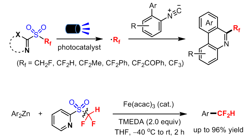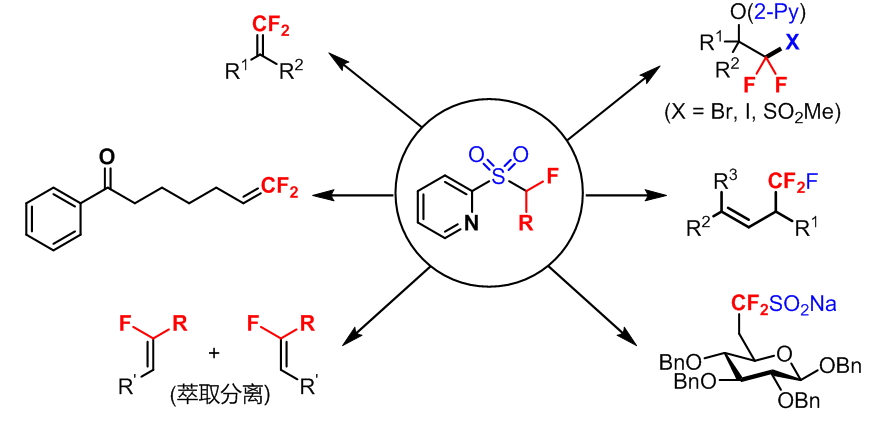 图一、氟烷基(2-吡啶基)砜试剂在氟烯基化和氟烷基化中的应用