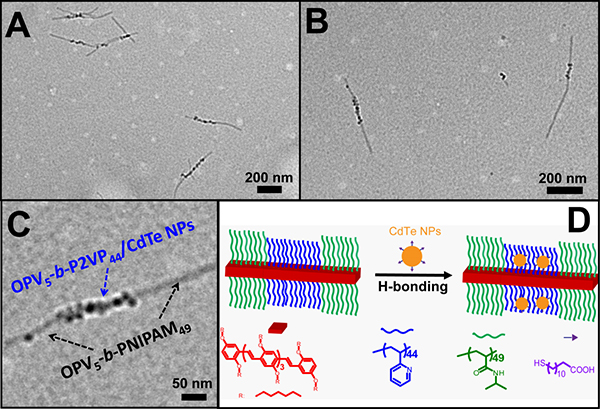 利用纤维胶束壳层中的PNIPAM与P2VP化学性质的显著差异,他们还实现了对含有不同壳层的多嵌段胶束的P2VP壳层的选择性功能化(图3)。例如,当把表面含有羧酸基团的CdTe量子点加入到以OPV为核、中间和两端壳层分别为P2VP和PNIPAM的三嵌段纤维状纳米纤维中后,所加入的CdTe量子点仅仅负载在中段P2VP壳层中,两端的PNIPAM壳层中几乎没有CdTe量子点。