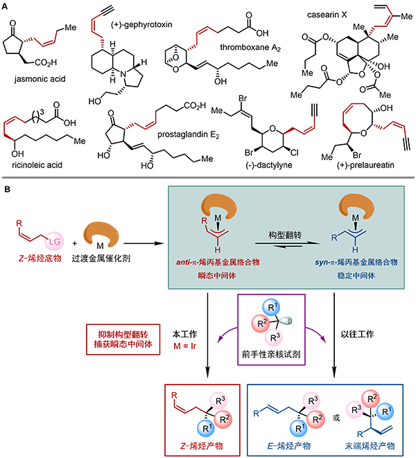 图1  (A) 含有Z-烯烃的手性天然产物和生物活性分子;(B) 过渡金属催化不对称烯丙基取代反应
