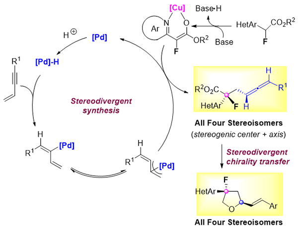 https://pubs.acs.org/doi/10.1021/jacs.1c03157)。该工作突破了传统局限于含多点手性中心的片段的立体发散性合成思路,通过利用Cu/Pd双金属催化共轭烯炔的非对映选择性的氢官能团化策略,实现了一系列兼具点手性和轴手性的片段的立体发散性合成。进一步基于立体发散性合成思路,再次将联烯产物转化得到所有四个氟代氢化呋喃环骨架,验证了该合成方法的可能应用价值。