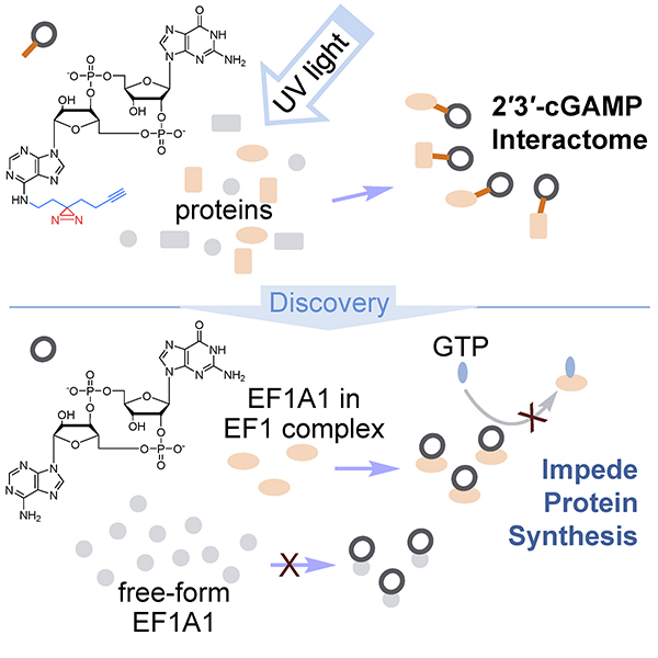 环二核苷酸2′3′-cGAMP是细胞天然免疫中的第二信使分子。当细胞受到病毒感染,病毒DNA暴露在细胞质中时,cGAS(cyclic GMP-AMP synthase)被激活并催化ATP和GTP合成2′3′-cGAMP。然后2′3′-cGAMP 将信号传导到STING(stimulator of interferon genes),激活下游IRF3和 NF-κB 引发细胞抗病毒的天然免疫响应。由于天然免疫在抗肿瘤过程中也有着重要作用,所以2′3′-cGAMP除了可以作为病毒疫苗佐剂,还可以应用于肿瘤免疫疗法。目前关于2′3′-cGAMP的研究基本上都基于cGAS-STING天然免疫通路,2′3′-cGAMP在细胞中是否还有其它结合蛋白、以及是否有着不依赖STING的生物功能却鲜有人知。