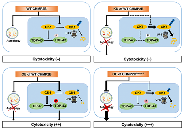 含有RNA结合蛋白TAR DNA-binding protein (TDP-43) 的异常蛋白聚集是肌萎缩性侧索硬化症 (amyotrophic lateral sclerosis, ALS) 和额颞叶痴呆 (frontotemporal dementia, FTD) 的关键病理标志物。ESCRT复合物蛋白charged multivesicular body protein 2B (CHMP2B) 也是一个与ALS和FTD都相关的致病蛋白,其致病机制被认为主要是它的突变引起内溶酶体-自噬通路功能障碍导致的。有趣的是,尽管超过95%的ALS病人和近45%的FTD病人中有TDP-43蛋白的异常聚集,在CHMP2B最常见的CHMP2BIntron5突变引起的FTD中没有检测到TDP-43蛋白的异常改变。因此,在以前发表的工作中,从未有人把TDP-43和CHMP2B这两个与ALS/FTD都相关的致病蛋白进行过分子机制上的关联研究。