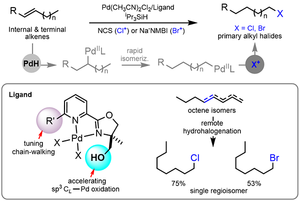 中国科学院上海有机化学研究所金属有机化学国家重点实验室刘国生课题组发展了首例钯催化内烯烃的远程氢卤化(包括溴化和氯化)反应,在吡啶-噁唑啉配体(Pyox)中引入羟基是调控该反应化学和区域选择性的关键;该催化体系适用于各种取代的分子内烯烃和末端烯烃,并表现出非常优秀的区域选择性,为混合烯烃到直链烷基卤化物的高效转化提供了新方法。该工作于2022年2月1日凌晨在Nature Chemistry期刊在线发表(DOI:10.1038/s41557-021-00869-x)。刘国生课题组的博士后李响和研究生金剑波是论文的共同第一作者,上海有机化学研究所为第一单位。
