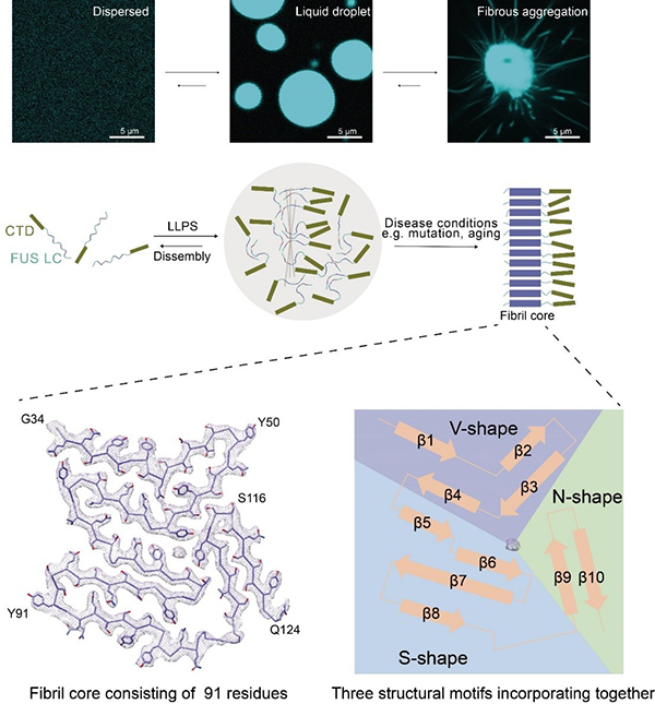 在正常生理情况下,蛋白质可以通过液-液相分离的动态组装形式在多种生物学过程中发挥并执行生物学功能。多种与渐冻人症相关的致病蛋白(如TDP-43,hnRNPA1以及FUS等)可以通过液-液相分离形成高度可逆的淀粉样蛋白原纤维,这个过程主要由亲水相互作用及低复杂性类淀粉样片段或可逆淀粉样蛋白核心RACs介导。外界压力刺激或疾病相关突变会促使其动态相分离调控的紊乱,导致蛋白进行液-固相转化并产生高度稳定的致病淀粉样聚集体。这种高度稳定的病理性淀粉样聚集体的产生和传播与相应疾病的发展密切相关。