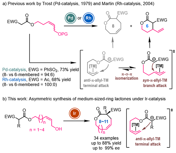 过渡金属催化的不对称烯丙基取代反应是构建碳-碳键和碳-杂键的重要方法。使用分子内不对称烯丙基取代反应可以合成含有烯烃片段的手性环状化合物。然而,由于构象限制,中环化合物(n元环)中烯烃一般为Z式构型。利用不对称烯丙基取代反应构建Z式烯烃需要在热力学较不稳定的anti-π-烯丙基金属中间体的末端发生亲核取代。然而anti-π-烯丙基金属中间体易于通过快速的“π-σ-π”异构化转化为热力学更稳定的syn-π-烯丙基金属中间体,随后接受亲核试剂进攻,得到小环产物(n-2元环)。因此利用不对称烯丙基取代反应合成手性中环化合物的报道十分有限(图1)。在1979年和2004年,Trost课题组和Martin课题组分别使用钯催化或铑催化分子内烯丙基取代反应实现了八元环分子的合成,但都还局限于消旋反应的研究。