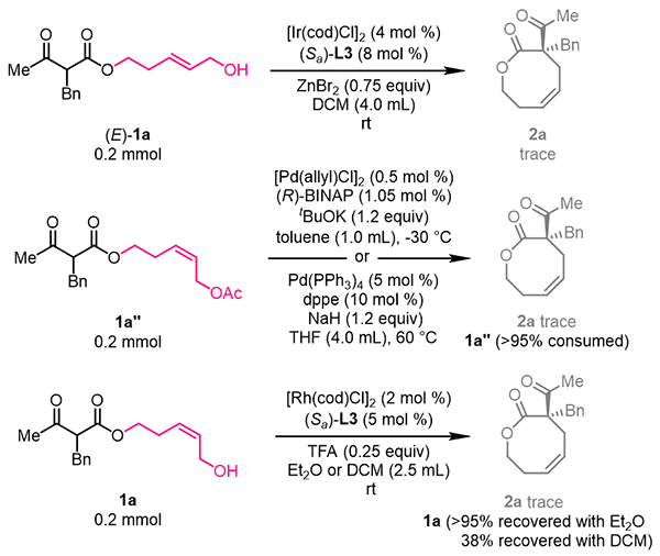 2021年,中国科学院上海有机化学研究所游书力研究员课题组报道了铱催化Z式保留不对称烯丙基取代反应。利用π-烯丙基铱中间体“π-σ-π”异构化过程相对较慢的特点,使用高活性前手性亲核试剂捕获热力学较不稳定的anti-π-烯丙基铱中间体,以优秀的对映选择性高效合成了一系列高烯丙位具有季碳手性中心的Z式烯烃化合物(Science 2021, 371, 380)。在此基础上,研究人员以连接β-酮酸酯结构单元的Z式烯丙醇为底物,通过合理筛选催化体系和反应条件,以中等到优秀的收率(up to 88%)以及优秀的对映选择性控制(up to 99% ee)实现了一系列手性中环内酯化合物的合成(图2)。该反应操作简便、条件温和,具有良好的官能团容忍性。研究人员发现β-位带有各类吸电子取代基(如酰基、酯基、砜基等)的酯类衍生物均可作为亲核试剂用于该反应,合成八至十一元环内酯类分子。在控制实验中,研究人员发现在标准反应条件下使用E式烯丙醇底物无法获得目标产物。并且研究人员尝试文献已知的钯或铑催化烯丙基取代反应的典型条件也无法得到目标产物。这些结果初步显示了铱催化Z式保留不对称烯丙基取代反应用于合成中环化合物的独特性(图3)。