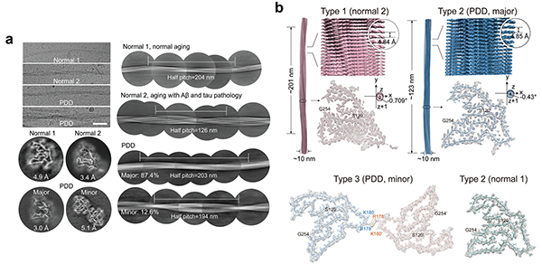 近日,交叉中心刘聪课题组与上海交通大学李丹课题组、复旦大学附属华山医院王坚课题组合作在Cell Research在线发表题为“Generic amyloid fibrillation of TMEM106B in patient with Parkinson's disease dementia and normal elders”的研究成果。该研究中,研究人员直接从一位伴有痴呆的帕金森病患者(Parkinson’s disease dementia, PDD)及两位高龄健康对照者的脑组织中提取、发现一种之前未知的全新病理蛋白聚集体,进一步揭示这种全新的蛋白病理聚集体是由跨膜蛋白106B(transmembrane protein 106B, TMEM106B)折叠成新颖的冰壶状片层结构单元并进一步自组装形成,此外还深入讨论了新发现的蛋白聚集体在NDs及衰老中的作用。