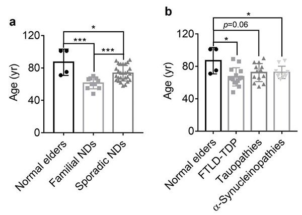 在本工作中,研究人员综合分析了本工作及以上三个工作中报道的用来提取TMEM106B纤维聚集体的脑组织捐赠者年龄在不同亚群中的分布特征,发现无论是以家族性及散发性NDs分类,还是以不同类别的NDs分类,NDs患者的年龄均显著低于健康对照组(图3)。据此,提出了疾病与年龄共同作为TMEM106B病理纤维聚集形成的两个关键驱动因素。