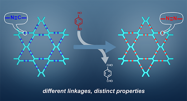偶氮键具有光致异构等独特性质和优异的光电功能,在材料科学、超分子化学、染料等领域获得较为广泛的应用。然而偶氮键的构筑反应可逆性较低,不利于缺陷结构自修复,因此很难通过常规单体缩聚的方法获得结晶性的聚合结构。针对这一难题,该课题组提出利用他们先前建立的基于连接体交换的“COF-to-COF”转化策略 (J. Am. Chem. Soc. 2017, 139, 6736),通过前体COF的模板作用引导产物COF结构的形成,以克服结晶问题。基于这一思路,研究人员以亚胺键连的COFs为前体,将其与对二亚硝基苯发生反应,将亚胺COFs结构中来自于对苯二甲醛的单元原位替换,从而实现了COFs中-C=N-连接键向-N=N-连接键的转化,得到对应框架结构的偶氮COFs。通过FT-IR光谱、13C 固体核磁共振波谱、Raman光谱、X射线粉末衍射、X射线光电子能谱、氮气吸脱附测试以及水解实验等一系列实验表征,研究人员确证了亚胺COFs到偶氮COFs的成功转化。在此基础上,研究人员对比了亚胺COFs和偶氮COFs的光物理性质和光催化能力差异,发现偶氮COFs具有更窄的光学带隙以及不同于亚胺COF的光催化降解有机染料性能,表明将亚胺连接键转化为偶氮连接键后对COF的性质带来了很大改变。