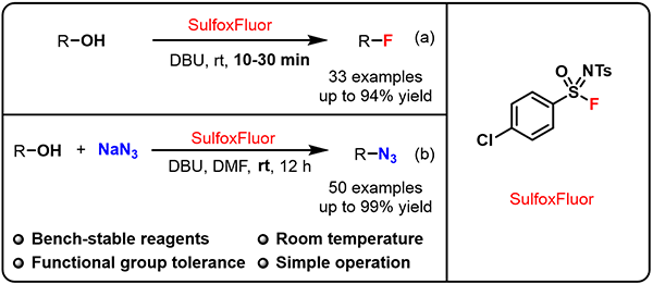 图3.SulfoxFluor的合成应用 (a. 脱氧氟化;b. 脱氧叠氮化)