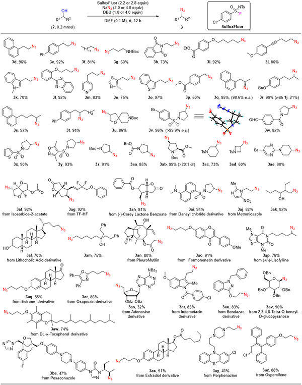 图4.SulfoxFluor促进的叠氮化钠对醇的脱氧叠氮化反应(细节详见Nat. Commun. 2022, 13, 2752)