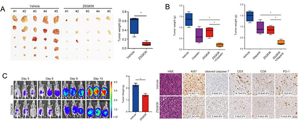 图2 ZSQ836在免疫缺失或正常的小鼠卵巢癌模型中的药效