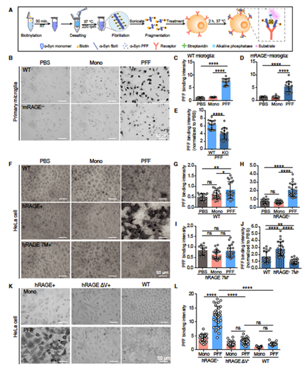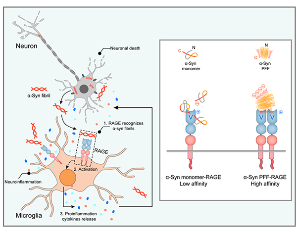 α-突触核蛋白(α-syn)的纤维聚集是帕金森病(Parkinson’s disease, PD)的主要病理标志。随着PD病程的发展,α-syn病理性纤维能够通过神经元表面的膜受体在神经元之间进行传播与扩散。同时,α-syn纤维聚集能够诱导小胶质细胞的激活与炎症反应。鉴定及表征小胶质细胞膜上识别α-syn病理纤维并激活细胞炎症反应的膜受体,对于阐释α-syn纤维的病理毒性及引起神经炎症反应的分子机制至关重要。RAGE (Receptor for Advanced Glycation Endproducts)作为小胶质细胞的一类重要膜受体,可识别并结合多种不同配体,并在不同疾病中发挥作用。有趣的是, RAGE受体在PD病人的黑质和额叶皮层中的表达量均增加,但其在PD中的作用尚不明确。