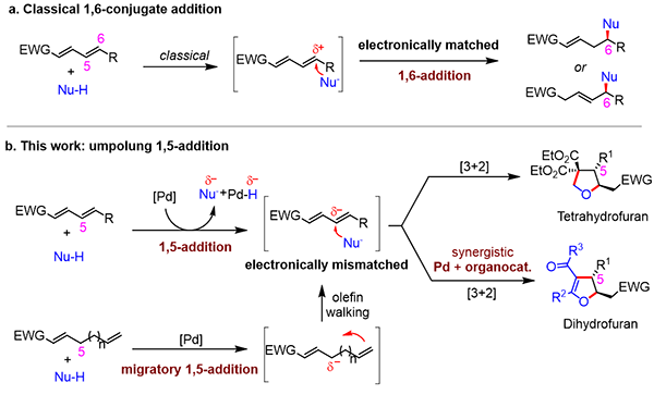 doi.org/10.1002/anie.202215568)。该工作利用钯氢催化策略,发展了一类新颖的极性反转的1,5-共轭加成反应,突破了过往所认为的只有底物电性匹配的1,6-加成才具有可行性的观念。