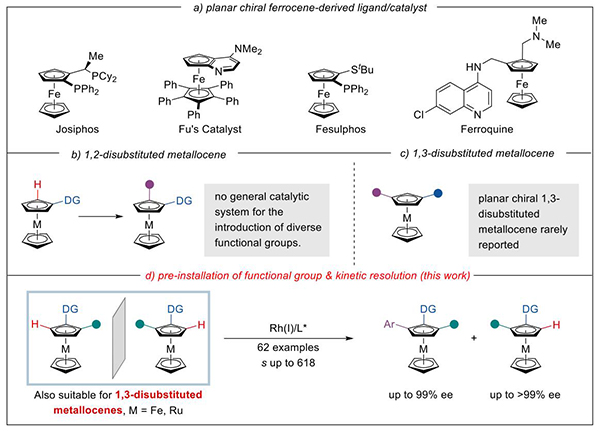 平面手性分子在不对称催化、生物医学和材料科学中均具有非常广泛的应用,特别是其已经作为高效催化剂或配体广泛应用在不对称催化中(图 1a)。因此,开发高效引入平面手性的方法受到化学家们的广泛关注。过渡金属催化的不对称碳氢键官能团化反应在过去几十年中取得了巨大的发展,为光学活性分子的合成提供了一种高原子和步骤经济的方法。值得注意的是,利用不对称碳氢键官能团化的方法已经实现了多种平面手性1, 2-二取代茂金属的合成(图1b)。然而,每种催化体系均只能引入特定官能团,目前仍然缺乏非常普适性的催化体系可以实现各类官能团的引入。与此同时,由于平面手性1, 3-二取代茂金属的高效合成方法缺乏,限制了相关的应用研究。因此,发展各类官能团化的1, 2-二取代以及1, 3-二取代平面手性二茂铁化合物的高效合成方法具有十分重要的意义。