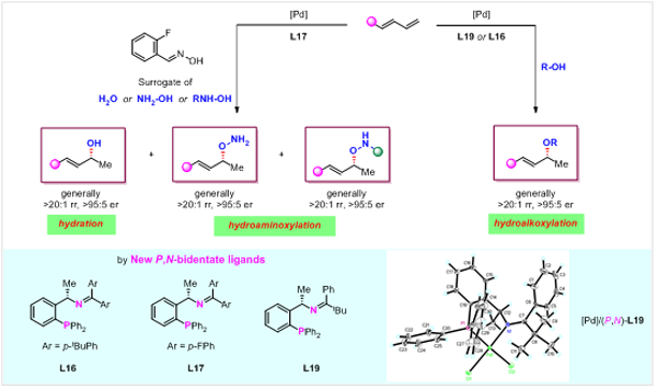 非保护的活性官能团的高效构建和引入,例如羟基、胺基、羟胺、胺羟、硫醇、羧酸、膦酸等具有重要意义,可以避免繁琐的保护和脱保护的操作。且此类基团还可以直接地进行大量的衍生化。但显然,由于非保护活性基团难以控制的配位、竞争性转化、不稳定性、溶解性等问题,严重阻碍了相关的研究。另一方面,针对共轭二烯的不对称氢官能团化方法的开发虽然取得了许多突破,可以实现不同类型手性中心的构建,包括C-N、C-C、C-S、C-P、C-Si等,但C-O键的构建一直无法突破。这主要是由于氧基亲核试剂的弱的亲核性以及产物的不稳定性所造成的。基于此,我们通过改良并合成了新的P,N-双齿配体,高效地实现钯催化共轭二烯的不对称氢烷氧基化反应。该反应对于不同的烷基醇及芳基或烷基取代的二烯,均能够很好的兼容,观察到中等到良好的收率,~90% ee以及高的区域选择性。随后,基于该类配体,通过利用氟代芳醛衍生的肟作为亲核试剂,再串联消除、水解或还原等过程,便可以实现形式的不对称水合反应和氢胺羟化反应,从而将简单的共轭二烯直接转化得到非保护的烯丙醇和烯丙基羟胺骨架。尤其是对于手性的烯丙基羟胺片段,目前尚未有高效的合成方法报道。