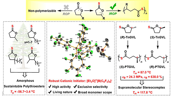 为解决阴离子催化体系存在副反应的问题,最近,研究团队设计合成了一种简单高效的新型阳离子引发剂[Et3O]+[B(C6F5)4]–, 首次实现了TnGVL及其衍生物的异构化驱动开环聚合,并且具有非常好的单体普适性,可实现十四种五元环硫羰代内酯单体的高效可控聚合,成功得到了一系列分子量(Mn)可达252.0 kg/mol、玻璃化转变温度在–56.7到3.4 °C之间大范围可调的聚硫酯材料。另外,当使用该引发剂进行光学纯TnGVL的聚合时,由于专一性的SN2机理,单体在链增长过程中发生100%的构型翻转,合成得到高等规的聚(γ-硫代戊内酯)(Pm > 98%),熔点高达87 °C,并且具有与商品化的代表性聚烯烃材料(如低密度聚乙烯、等规聚丙烯)相媲美的机械性能。而且,基于不同构型的等规聚合物的物理共混,发展了一种高结晶性的新型超分子立体复合物,其熔点高达117.6 °C。此外,研究团队发现得到的含硫高分子在外界刺激下可以发生可控降解,是一类新型的高性能可持续性高分子材料。