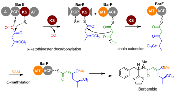 首先,通过体外重构巴巴酰胺装配线上一碳单元的脱除反应,发现仅需要两个装配线蛋白BarE和BarF就能实现C1单元的脱除,不需要反式酶的参与。进一步通过装配线上中间体的检测,证明酮基合成酶功能域KS是催化C1单元脱除的关键催化功能域,通过亲核进攻α-酮基来实现硫酯碳的脱除,后续再发生经典的克莱森缩合反应,结果上实现净一碳单元的延伸。对脱除的C1单元进行捕获时,发现不是以常见的甲酸和二氧化碳的形式离去,而是以酶催化反应中并不常见的CO形式离去。进一步和薛小松研究员课题组合作,结合理论计算、同源建模和保守残基点突变等实验,推测该KS功能域通过保守的极性残基对硫酯进行活化来促进脱羰基反应,实现巴巴酰胺装配线上碳骨架的编辑。最后,通过对催化脱羰基反应的装配线蛋白进行序列关联性分析,发现KS功能域催化的α-酮基硫酯脱羰基反应具有一定的普适性,推测已知含有C1单元脱除的分子cryptophycins、microsclerodemin M、microcrystin LR和nodularin可能也采用相似的机制脱除CO以完成分子骨架的编辑。