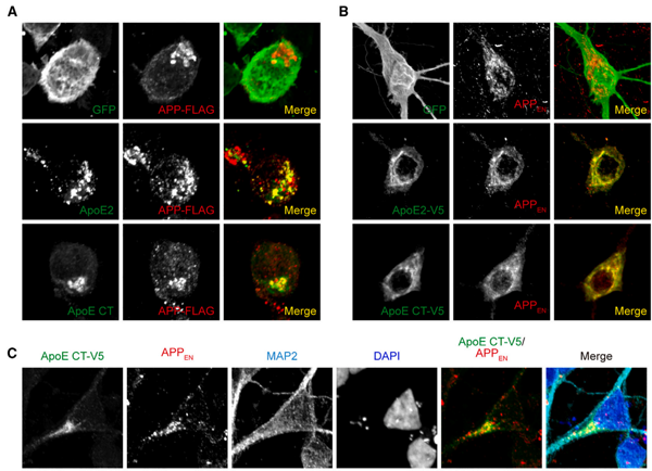 阿尔茨海默病(Alzheimer’s disease,AD)是一种常见的神经退行性疾病,可影响大脑认知、记忆能力。目前AD致病机制的认知多来源于对家族遗传性AD(fAD)的研究。淀粉样前体蛋白(APP)和γ分泌酶的酶切活性中心(PS1和PS2)的一些突变加速淀粉样斑块的形成,最终导致fAD。但fAD仅占所有AD的~1%,另外~99%是非家族遗传性的散发性AD(sAD)。sAD患者并不携带导致fAD的APP或者PS1/2突变。载脂蛋白E4(ApoE4)是sAD最大的风险因子。约有14%的人携带至少一个ApoE4基因。携带两个ApoE4拷贝的人与携带正常ApoE3的人相比,患AD的风险增加十倍,并且患病年龄提前至70岁之前,病患程度也大大增加。而ApoE2却能显著降低AD的发病风险。虽然对AD的影响截然不同,但ApoE2,ApoE3和ApoE4的氨基酸序列仅有1-2个位点的不同。目前并不清楚为什么同一基因编码的不同ApoE异构体在AD进程中发挥着截然相反的影响。sAD风险基因ApoE与fAD致病基因APP和PS1/2之间是否有功能上的联系也是不清楚的。