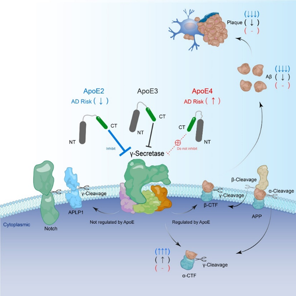 陈椰林课题组发现ApoE异构体带来的致病风险与其直接特异性抑制APP的γ剪切活性相关,提出了ApoE异构体改变AD风险的新理论。具有保护作用的ApoE2具有最强的抑制活性,而增加患病风险的ApoE4则失去了该活性,因此两者在AD疾病进程中功能截然不同。该理论首次将fAD的致病基因和sAD的风险基因从功能上直接联系在一起,提示APP的γ酶切异常是fAD和sAD共同的致病原因。