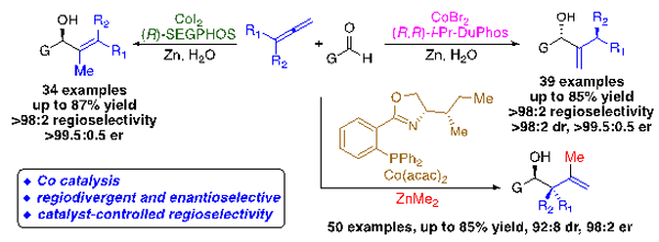 图:钴催化1,1-二取代联烯与醛发散式区域选择性的不对称偶联反应