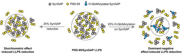 图2. O-GlcNAcylation调控PSD-95/SynGAP 液-液相分离的示意图