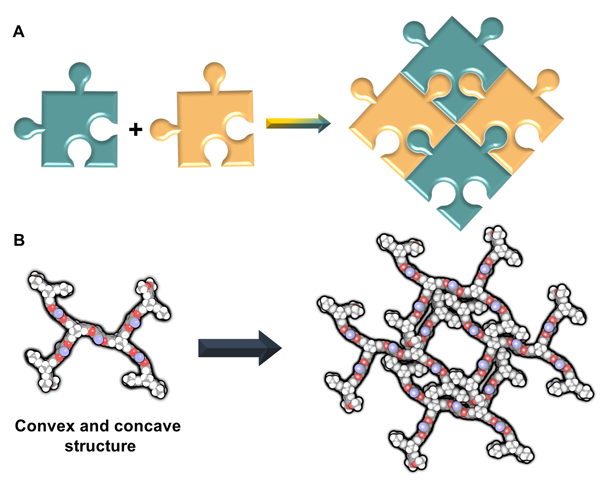 图1. 拼图的组装模式 (A) 和有机多孔分子晶体中类拼图的组装模式 (B)。