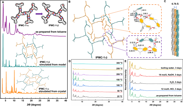 图2. PMC的组装模式、粉末X-射线衍射信号对比和稳定性测试