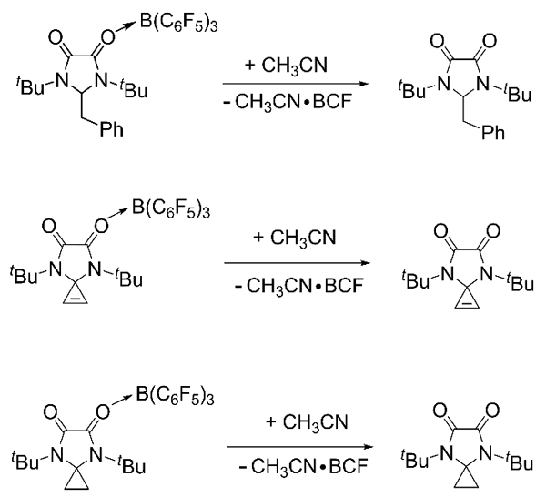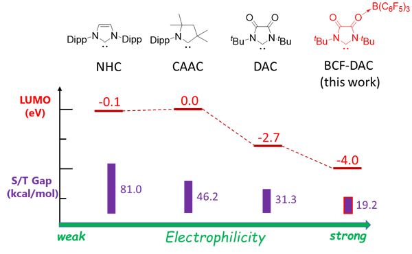 在该工作中,他们将BCF与DAC配位后,得到了一种全新的稳定Lewis酸-卡宾杂化物结构(图3)。理论计算表明,卡宾的LUMO能量从与BCF配位前的-2.7 eV降低到-4.0 eV,单/三线态能量差也从配位前的31.3 kcal/mol降低到19.2 kcal/mol。DAC与BCF配位后,发生了分子内电子转移,不仅亲电性得到了极大提高,反应活性也有同步提升。杂化物中的Lewis酸通过与强碱Ph3P的反应从BCF-DAC中解离,证明BCF的配位和解离形成杂化物可以具有一定的动态特征(图3)。