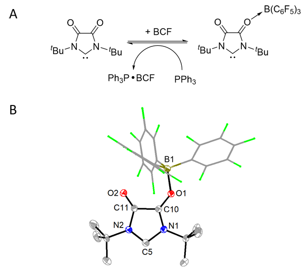 图3 (A)卡宾BCF-DAC的可逆配位过程;(B)卡宾BCF-DAC的晶体结构。