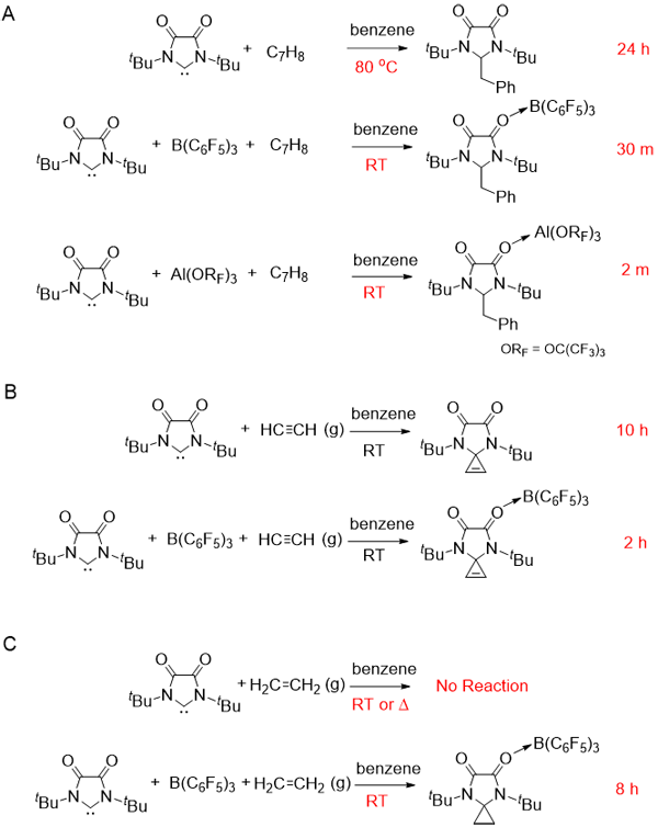 DAC的亲电性可以通过与不同的Lewis酸配位来调节。在B3LYP/6-31G(d)计算精度下,Lewis酸-DAC杂化物的LUMO能量(单位:eV)依次排序为:B(C6F5)2H (-3.91) < BCF (-4.00) < B(C6F5)2Cl (-4.12) < BCl3 (-4.13) < AlCl3 (-4.24) < Al(ORF)3 (ORF = OC(CF3)3) (-4.25) < BBr3 (-4.26)。由计算结果可知,BBr3的酸性最强,其与DAC杂化物的亲电性也最强。实验表明,甲苯与Al(ORF)3-DAC杂化物的反应比BCF-DAC杂化物快得多(如图4A和图5B所示),这与LUMO能量顺序一致。类似的行为发生在不同Lewis酸与DAC的杂化物与乙烯(BCF为8h,Al(ORF)3为2h)和乙炔(BCF为2h,Al(ORF)3为0.5 h)的反应中。然而,像BBr3这样的体积较小的路易斯酸可能会与DAC的卡宾碳发生一系列复杂反应。体积较大和商业化的BCF固体Lewis酸,是该策略中的首选。
