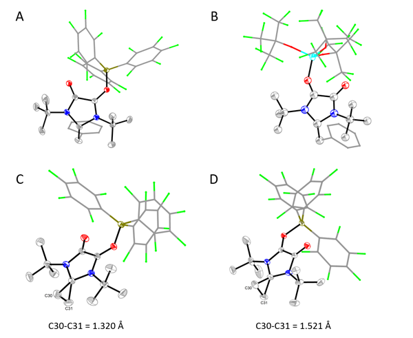 为了研究该卡宾与BCF配位前后反应活性的影响,我们将DAC与甲苯、乙烯和乙炔进行反应。DAC在加热至80 C 后24至48小时可以插入甲苯的苄基C-H键。加入BCF后,DAC仅需30分钟即可在室温下完成反应,而使用更强的Lewis酸Al(ORF)3 (ORF = OC(CF3)3)则能让该反应的速率进一步提升(图4A)。类似地,DAC与乙炔的[2+1]环加成反应的完成时间从10小时减少到2小时(图4B)。更引人注目的是,DAC即使在加热时也不会与乙烯反应,但在加入BCF后,常温常压下即可与乙烯发生[2+1]环加成反应(图4C)。由于其优异的亲电性,该杂化物成为首个能够直接与乙烯反应的稳定卡宾。所有产物均通过单晶X射线衍射(图5)和核磁共振等手段进行了表征。