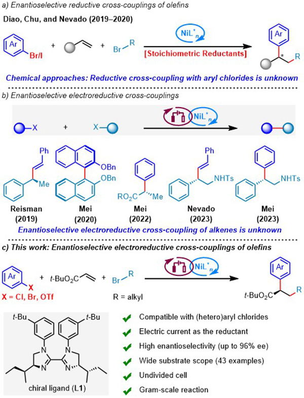 有机电合成利用清洁的 电能驱动氧化还原反应,无需外加化学氧化剂或还原剂,同时其电流电位可以精准调控,在合成化学中具有巨大的应用潜力。最近,电促镍催化的不对称还原偶联反应取得了长足的进步,然而依然局限于两个亲电试剂的不对称还原偶联反应。