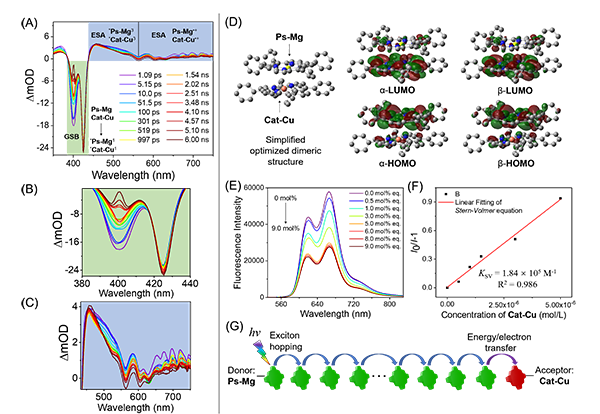 该工作受蓝细菌藻胆体启发,人工组装体结构通过聚电解质PDDA模拟蛋白质骨架的同时利用金属卟啉模拟色素团分子得以实现。在水中,阳离子型PDDA与具有光敏和催化功能的阴离子型金属卟啉共组装生成一维光合组装体,从而模拟藻胆体棒状天线结构和催化中心(图1)。该光合组装结构可实现水相光催化产H2,其效率相比单体分子提升23倍以上。通过形成纳米组装结构,光敏和催化金属卟啉的光稳定性相对单体结构显著提升。研究人员进一步借助瞬态吸收光谱、荧光光谱和理论计算研究了光催化机制(图2)。光照后,研究人员通过飞秒级瞬态吸收光谱观察到有金属卟啉阳离子自由基生成,说明可能存在光诱导的电子转移过程;理论计算同时支持镁卟啉与铜卟啉之间通过电子转移生成电荷分离态。此外,荧光光谱和瞬态吸收光谱实验也支持光合组装体内存在能量转移过程。因此,该仿生组装体系统中的光敏金属卟啉可以通过能量转移和电子转移协同过程使光能从光敏剂传递至光催化中心,从而实现了高效的水相光催化质子还原产H2。通过优化光催化条件,该组装体的光催化产H2能显著优于其它金属卟啉组装体系。光照下,此光合组装体的产氢速率和转化数(TON)可达51,776 mol h-1 g-1和1299。该研究不仅加深了对天然藻胆体光合作用结构与机制的理解,而且为构筑水相仿生超分子光合组装体系统提供了新的思路。