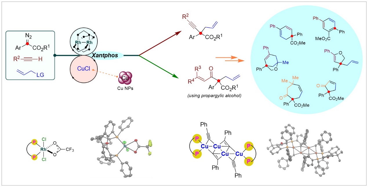 中国科学院上海有机化学研究所金属有机化学国家重点实验室王晓明课题组致力于研究多金属物种参与的反应体系,包括仿酶的双多核金属催化剂的开发和金属物种的现场簇集和催化等。近日,在该课题组已经取得一定进展的双(多)核金属催化的工作基础上(J. Am. Chem. Soc. 2021, 143, 11799; ACS Catal. 2021, 11, 13696; Nat. Commun. 2021, 12, 3813; ACS Cent. Sci. 2022, 8, 581; Angew. Chem. Int. Ed. 2023, 10.1002/anie.202307973; JACS Au 2023, 3, 2862; Nanoscale 2023, 15, 3560; J. Am. Chem. Soc. 2023, 145, 24877; Chem. 2024, 10, 265),他们报道了金属铜/铑-双金属协同催化的卡宾发散性双官能团反应(J. Am. Chem. Soc. 2024, 10.1021/jacs.3c12162)。反应可以将重氮、端炔和烯丙基底物一步转化为1,5-烯炔化合物,该化合物可用于后续的多种转化从而快速构建环状的分子骨架。另外,采用炔丙醇作为端炔底物时,反应则会发生Meyer−Schuster重排生成卡宾的酰基-烯丙基化产物。他们进一步关注于两个金属催化剂前体的演变过程。炔基铜和双膦配体反应生成了四核的铜团簇,说明铜物种可能发生簇集。进一步地,反应明显的诱导期,汞毒化实验和商品化的铜纳米粒子替代实验以及透射电子显微镜等都说明,预催化剂氯化亚铜可能在反应体系中发生现场簇集,生成铜纳米粒子并催化卡宾与端炔的反应。双核铑催化剂在反应体系中则可能发生解离,生成双膦配体配位的单核铑物种,并推测双核铑或解离后的单核铑都可能催化烯丙基烷基化过程。最终,现场簇集的铜纳米粒子催化的卡宾插入反应与金属铑络合物的催化的烯丙基取代反应的协同,被认为是该反应所经历的催化过程。