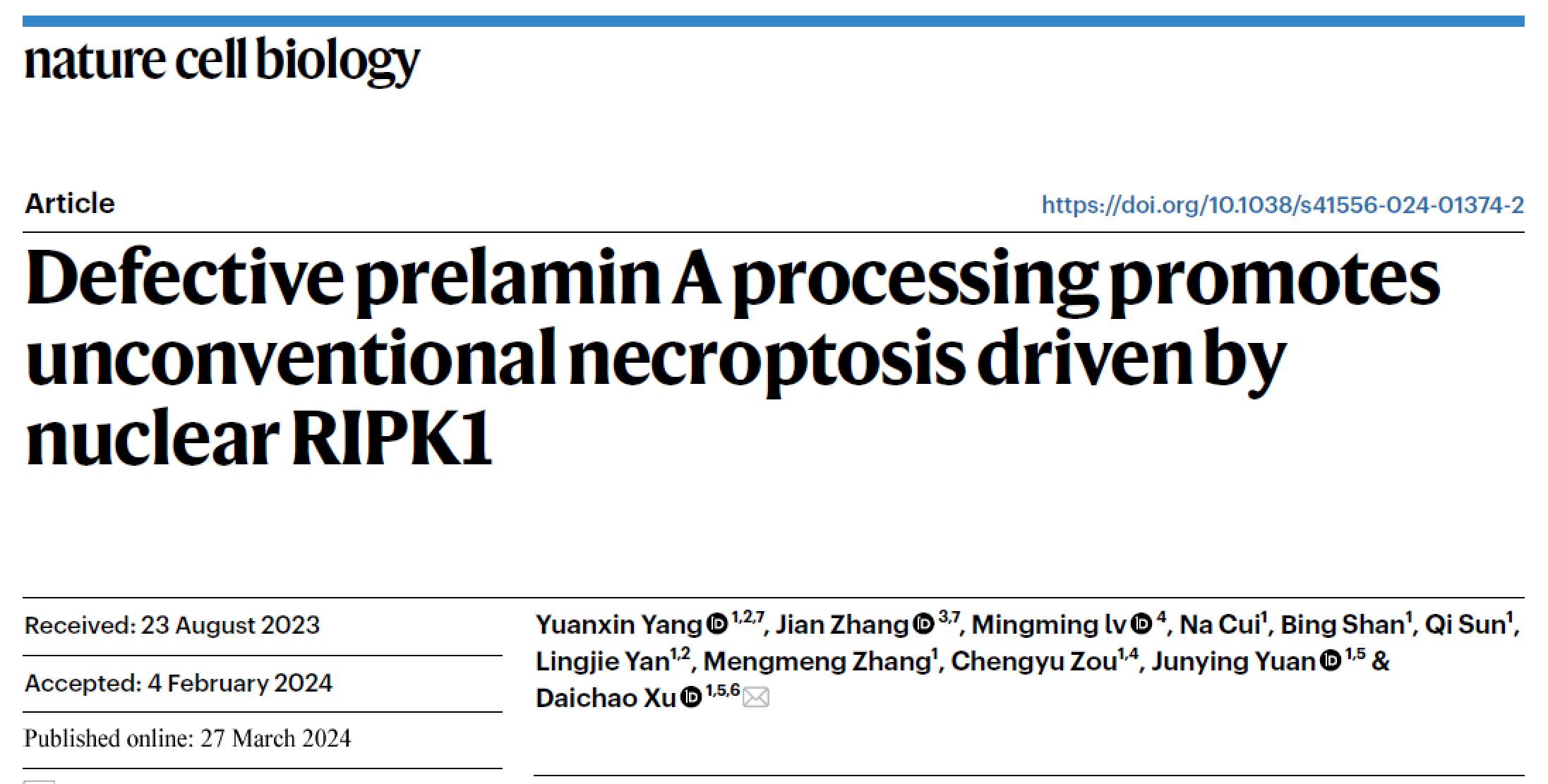 2024年3月27日,中国科学院上海有机化学研究所生物与化学交叉研究中心许代超课题组在Nature Cell Biology发表了题为“Defective prelamin A processing promotes unconventional necroptosis driven by nuclear RIPK1”的研究论文,揭示了一种全新的由毒性蛋白prelamin A启动的细胞核程序性坏死通路。这种细胞核程序性坏死由核RIPK1介导,并诱导细胞核坏死小体的形成,进而引起核膜的破裂和DNA向胞质中的泄露,从而造成强烈的炎症反应和最终的细胞死亡。
