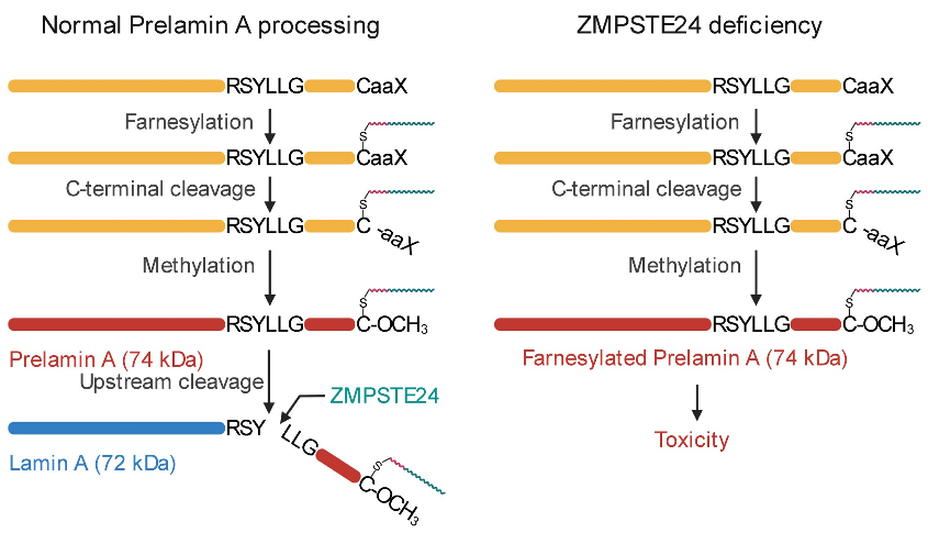 图1. 左,正常情况下, prelamin A经过法尼基化修饰最终被锌金属蛋白酶ZMPSTE24剪切去除C-端形成成熟的lamin A。右,ZMPSTE24基因突变造成法尼基化的prelamin A在细胞中发生累积并造成毒性。