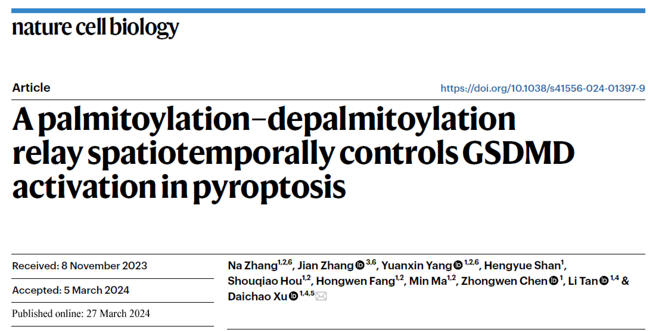 2024年3月27日,中国科学院上海有机化学研究所生物与化学交叉研究中心许代超团队在Nature Cell Biology发表了题为“A palmitoylation-depalmitoylation relay spatiotemporally controls GSDMD activation in pyroptosis”的研究论文,揭示了一种由S-棕榈酰化-去棕榈酰化接力所介导的细胞焦亡调控机制。这种接力机制以时空依赖性的方式控制GSDMD的剪切、质膜转位和寡聚。
