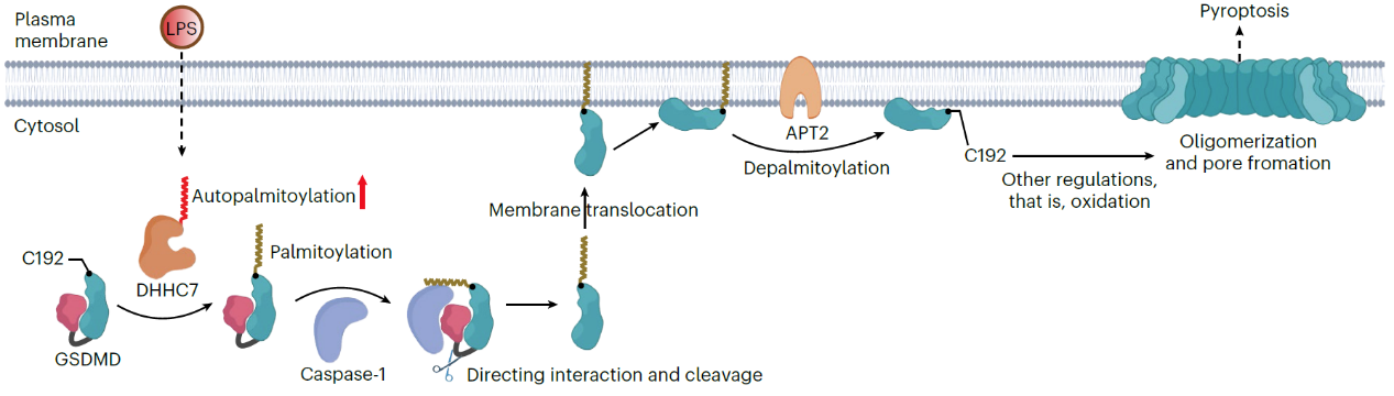 研究人员发现,在细胞焦亡过程中,鼠源GSDMD在氨基末端结构域的保守Cys192残基上发生可逆性S-棕榈酰化修饰。在巨噬细胞中,多种刺激均会诱导GSDMD发生棕榈酰化,该过程由棕榈酰转移酶DHHC7介导。这种修饰增强了GSDMD与caspase的相互作用,从而促进了GSDMD的剪切(图1)。进一步分析发现棕榈酰化能够在空间上促进剪切后形成的活性GSDMD-NT从细胞质易位到细胞质膜上(图1)。