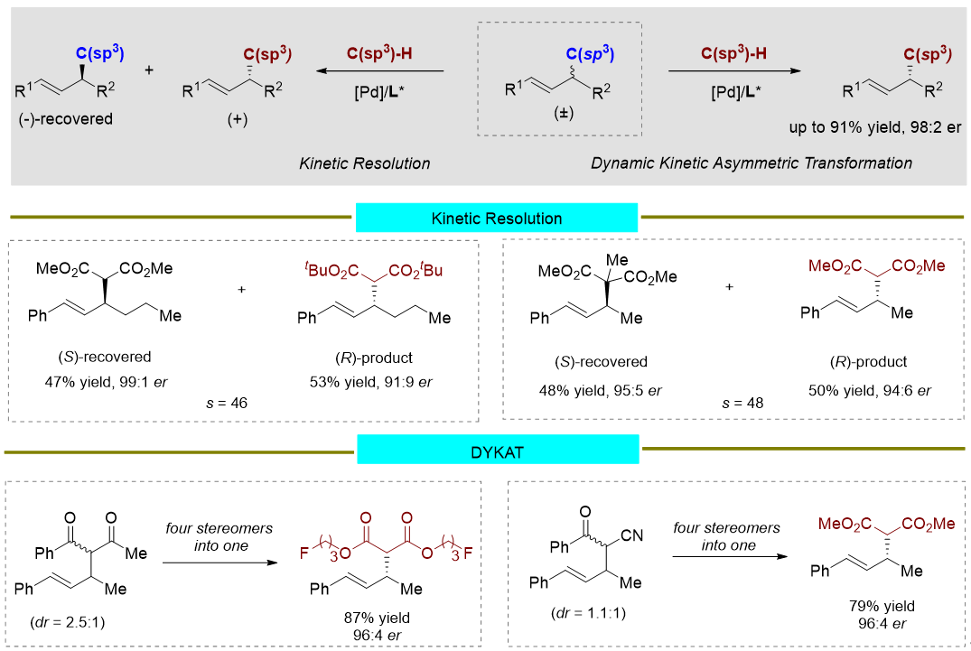 相对于不对称C-H键活化转化,惰性C-C键的不对称转化研究非常有限,且多局限于张力环结构底物。而非张力C(sp3)-C(sp3) 键的催化不对称官能团化的研究几乎处于空白阶段。近日,中国科学院上海有机化学研究所何智涛课题组在国际知名化学期刊Nature Synthesis上在线发表了题为 “Intermolecular Asymmetric Functionalization of Unstrained C(sp3)-C(sp3) Bonds in Allylic Substitution Reactions”的研究论文 (Nat. Synth. 2024, 10.31635/ccschem.024.202404296.)。该工作实现了烯丙位惰性烷基C-C键的催化不对称官能团化。通过不同的催化条件,可分别实现消旋底物的动力学拆分和动态动力学不对称转化过程(图1)。经典的不对称烯丙取代反应中,C-C键的形成通常是反应进行的方向。而该工作证明烯丙位C-C键也可以作为不对称烯丙基取代的反应底物,颠覆了以往的认知。