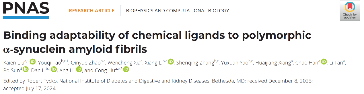 2024年8月22日,来自中国科学院上海有机化学研究所生物与化学交叉研究中心的刘聪课题组在《美国国家科学院院刊》(PNAS)期刊上发表了文章“Binding adaptability of chemical ligands to polymorphic α-synuclein amyloid fibrils”。该研究系统分析了不同化学小分子与帕金森病关键病理蛋白α-突触核蛋白(α-synuclein,α-syn)形成的不同amyloid polymorphs的结合位点与模式,首次揭示了小分子在识别与结合不同polymorphs时的高度可塑性。该工作是在刘聪课题组2023年提出的化学分子与淀粉样聚集互作的基本规律(https://www.nature.com/articles/s41589-023-01370-x)的基础上进一步深化的成果。这项工作进一步拓展和完善了化学分子与淀粉样聚集的互作理论,而且为病理蛋白聚集纤维的分子探针设计、研发以及其在临床应用中的潜力展现了新的前景。